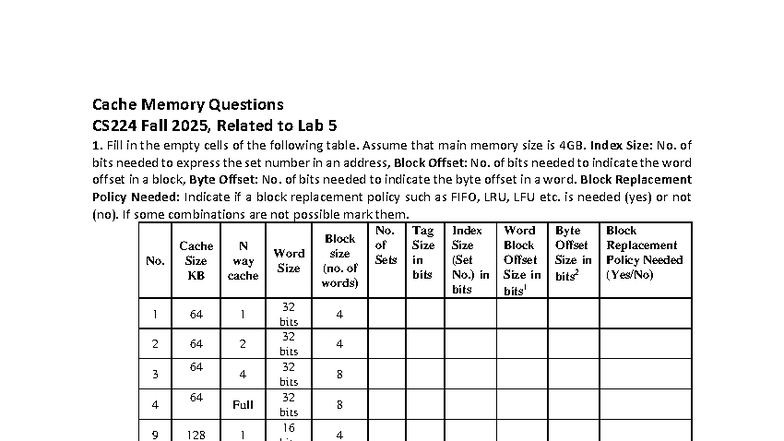 Cache Memory Questions CS224 Lab 5 - Fall 2025 Analysis - Studocu