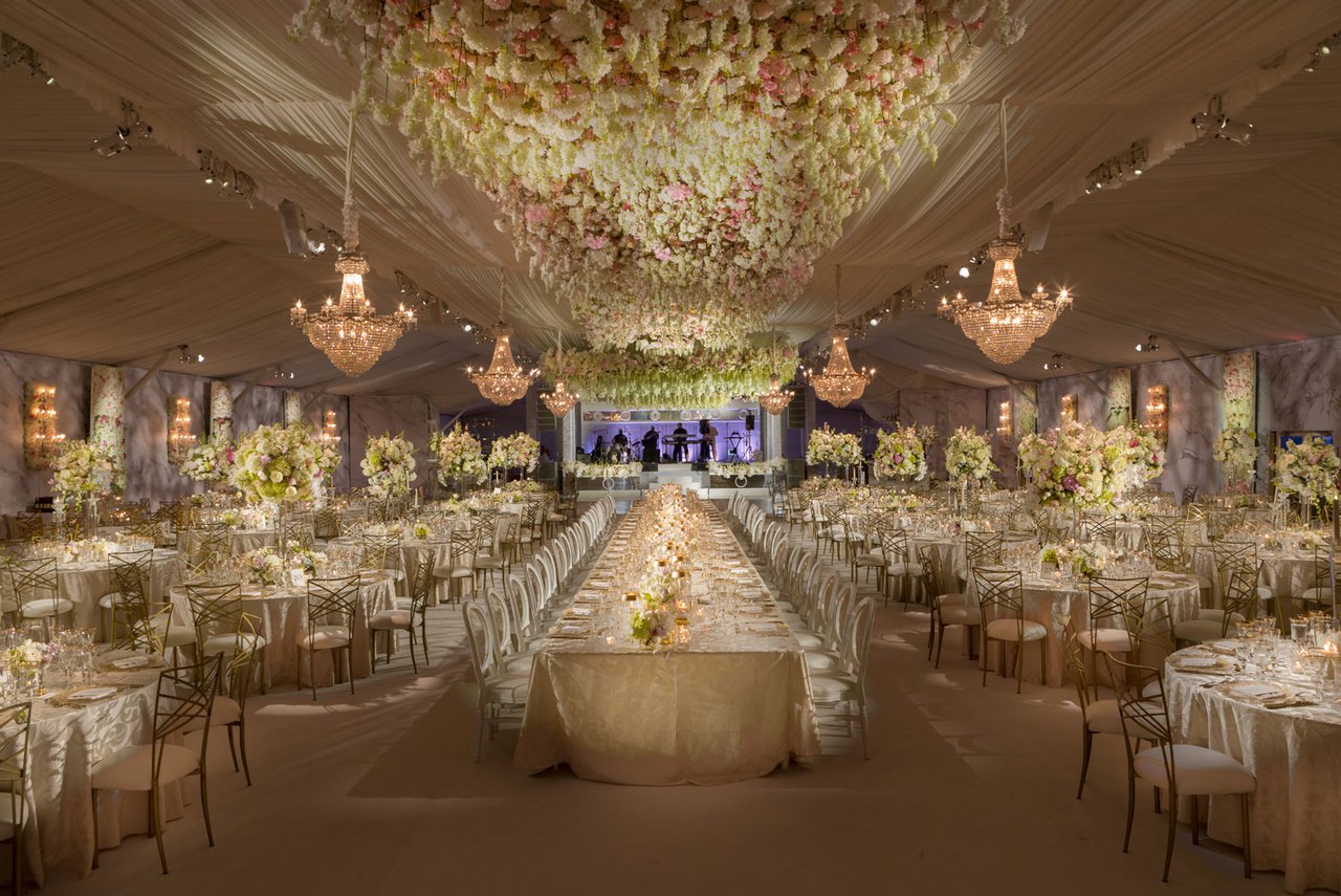 Grand Ballroom Wedding Dinner Reception full of Floating Flowers and ...