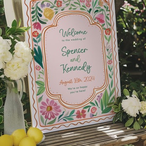 Wedding Welcome Sign Template for Spring Floral Theme, Pink Green Hand ...