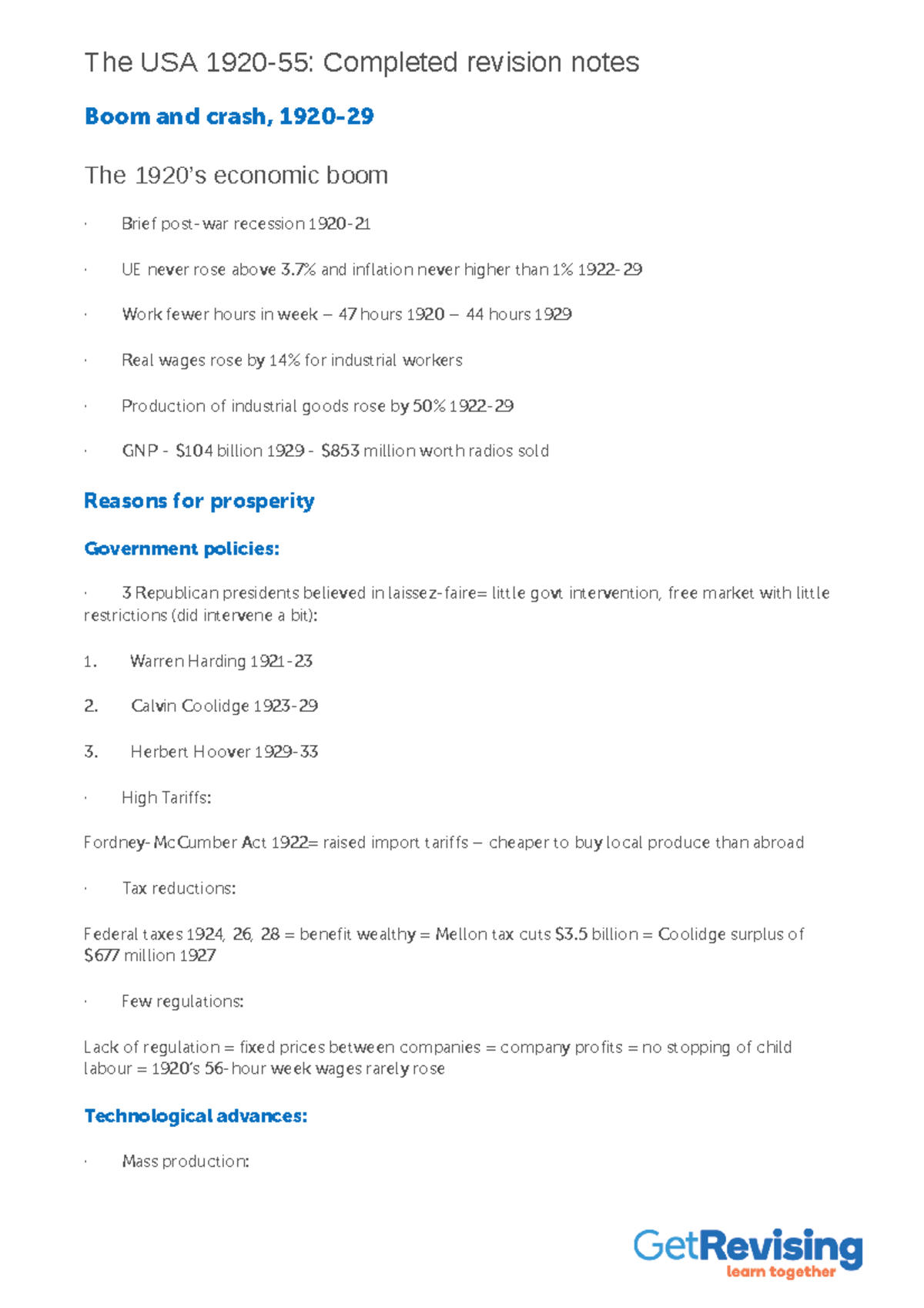 The USA 1920-55: Economic Boom, Recession, and Social Changes Revision ...