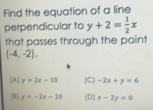 Solved: Find the equation of a line perpendicular to y+2= 1/2 x that ...