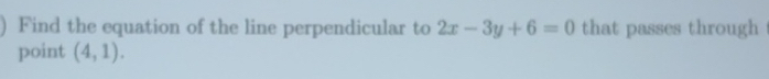 Solved: Find the equation of the line perpendicular to 2x-3y+6=0 that ...