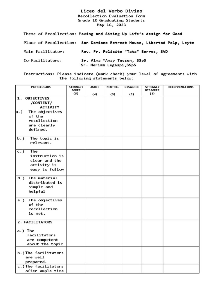 Recollection Program Proposal for Grades 10-12 & College Students - Studocu
