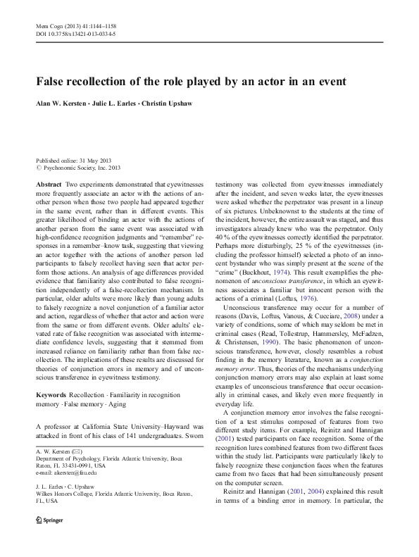 (PDF) False recollection of the role played by an actor in an event
