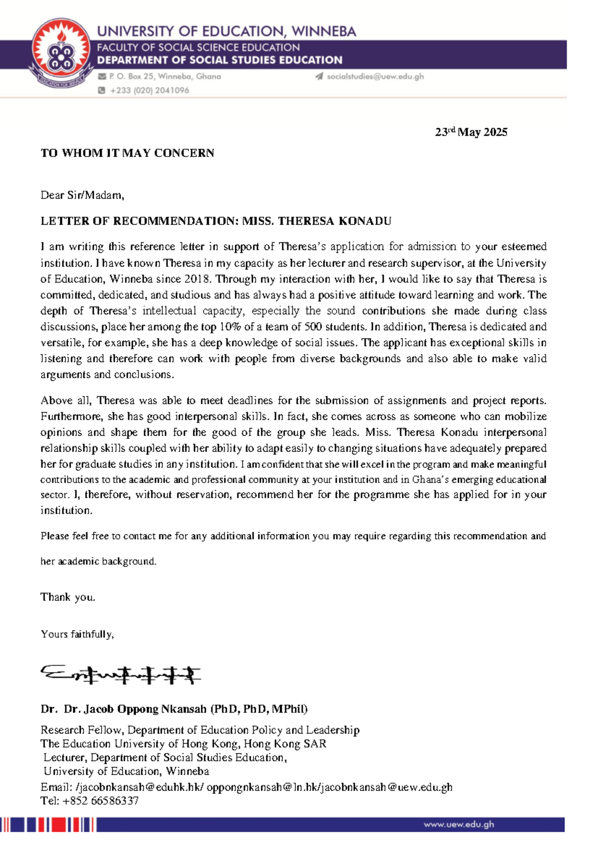 Letter of Recommendation for Miss Theresa Konadu - Studocu