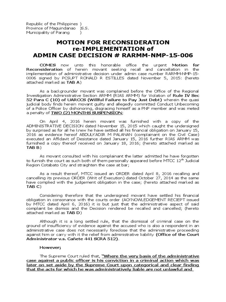 Motion For Reconsideration Re-Implementation of Admin Case Decision ...