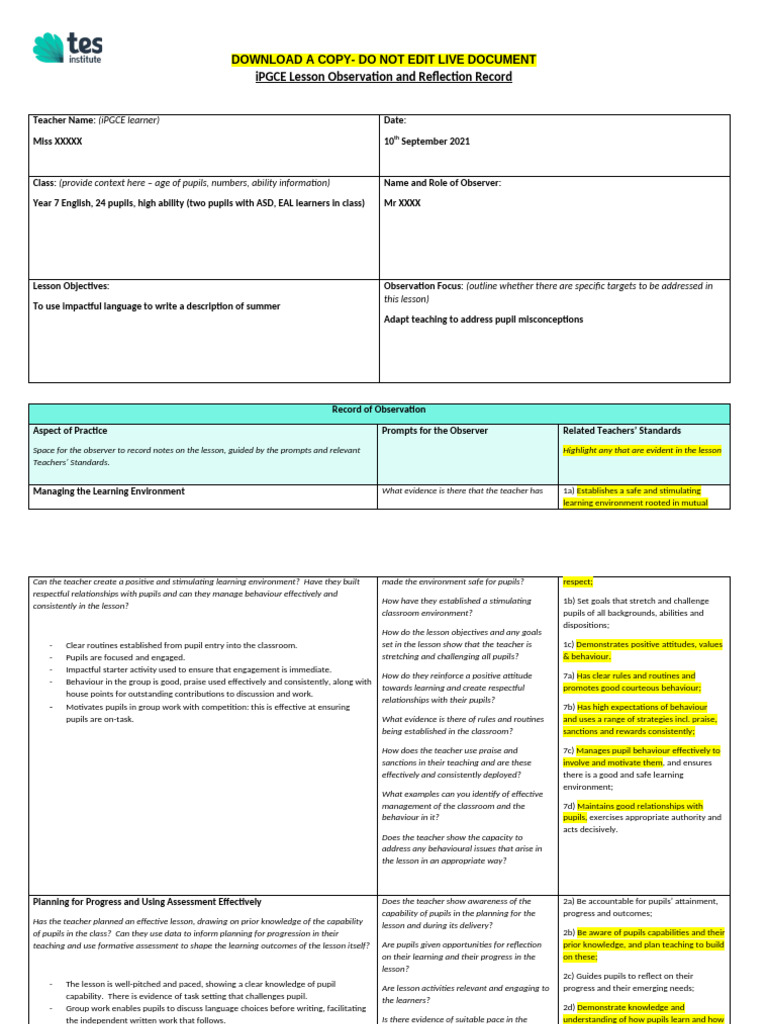Example of A Completed Lesson Observation and Reflection Record | PDF ...