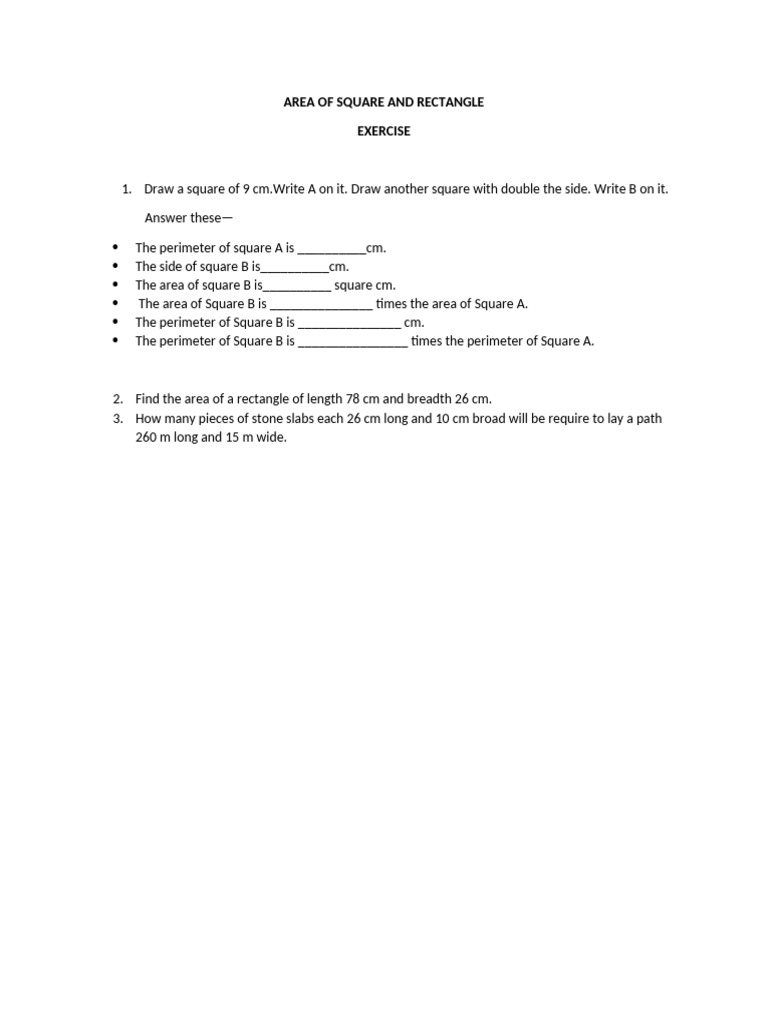 Area of Square and Rectangle - Exercise | PDF
