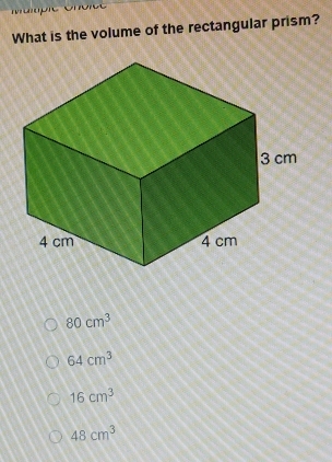 Solved: What is the volume of the rectangular prism? 80cm^3 64cm^3 16cm ...