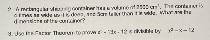 Solved 2. A rectangular shipping container has a volume of | Chegg.com
