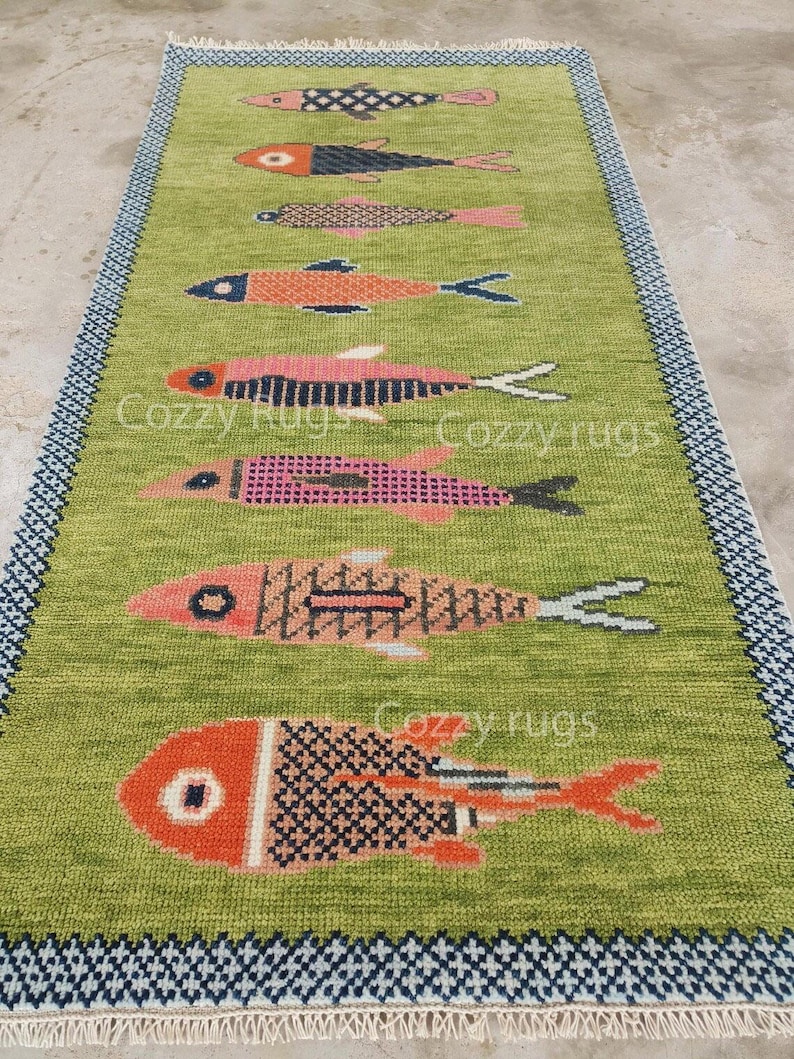 Hand-knotted Wool Runner Rug: Colorful Koi Fish Design, Green Carpet ...