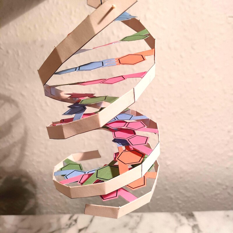 Red yellow nodes appearing rods extending forming double-helix twisting ...