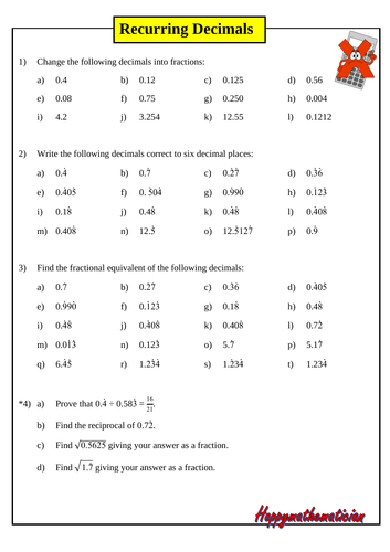 Recurring Decimals Worksheet | Printable Maths Worksheets