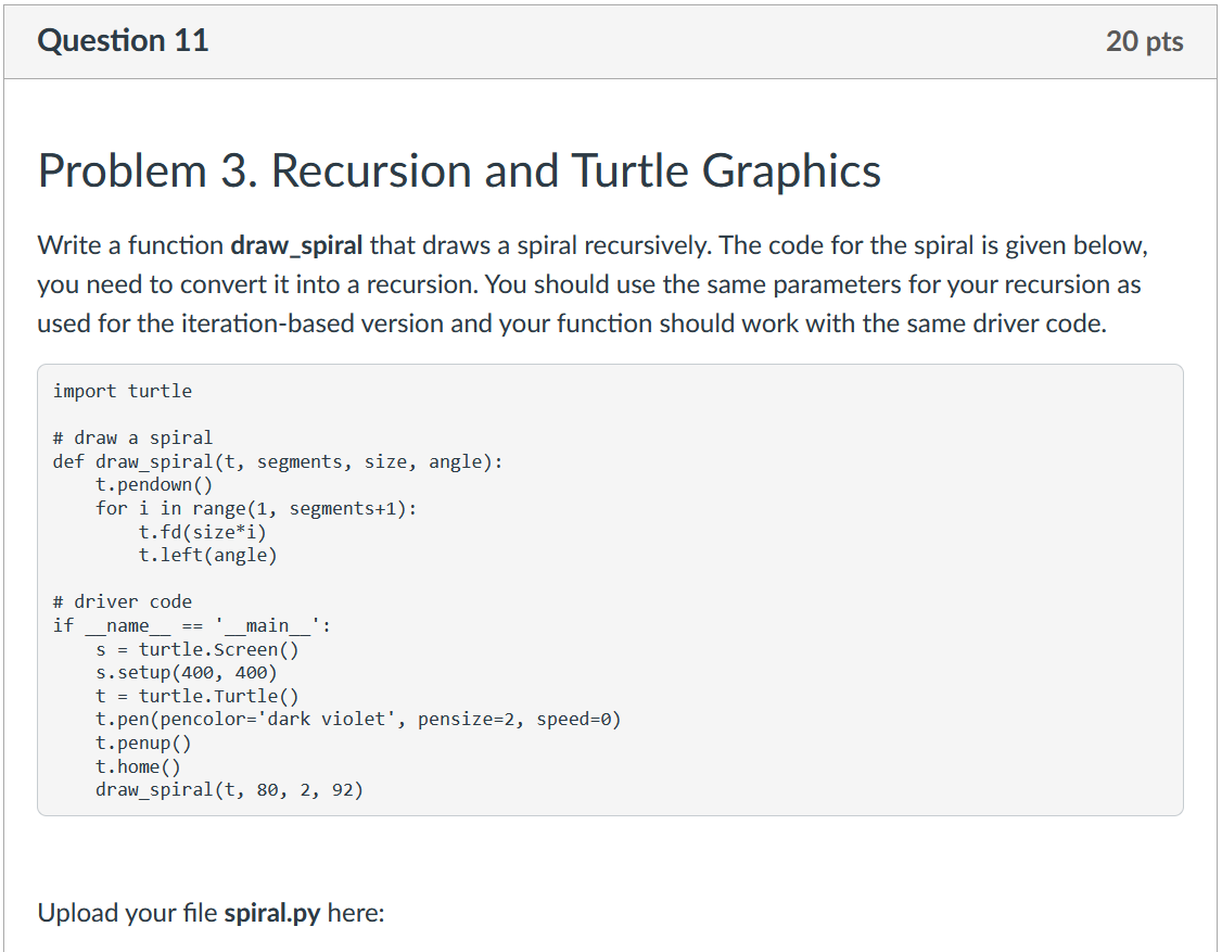Solved Question 11 20 pts Problem 3. Recursion and Turtle | Chegg.com