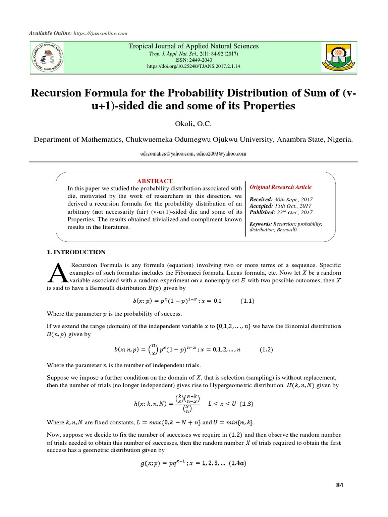 Recursion Formula For The Probability Distribution of Sum of (V-U+1 ...