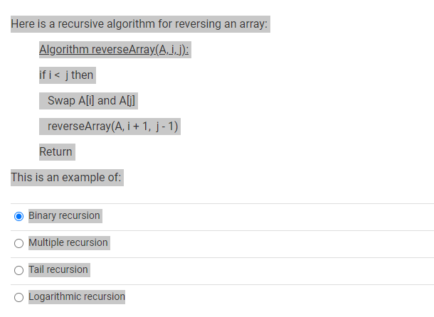 Solved Here is a recursive algorithm for reversing an array: | Chegg.com