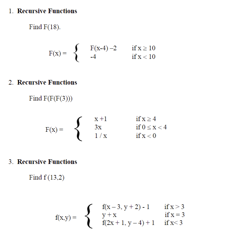 Solved 1. Recursive Functions Find F(18). F(x)={F(x−4)−2−4 | Chegg.com