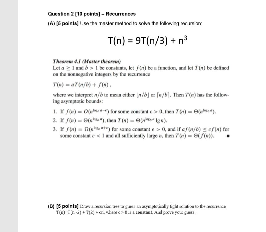 Question 2 [10 points) - Recurrences (A) (5 points] | Chegg.com