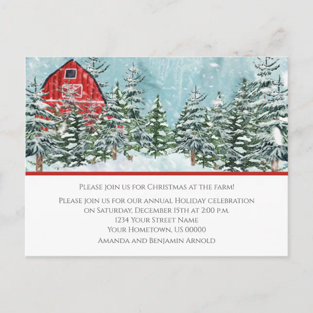Red Barn Farm Christmas Holiday Party Invitation Postcard | Zazzle