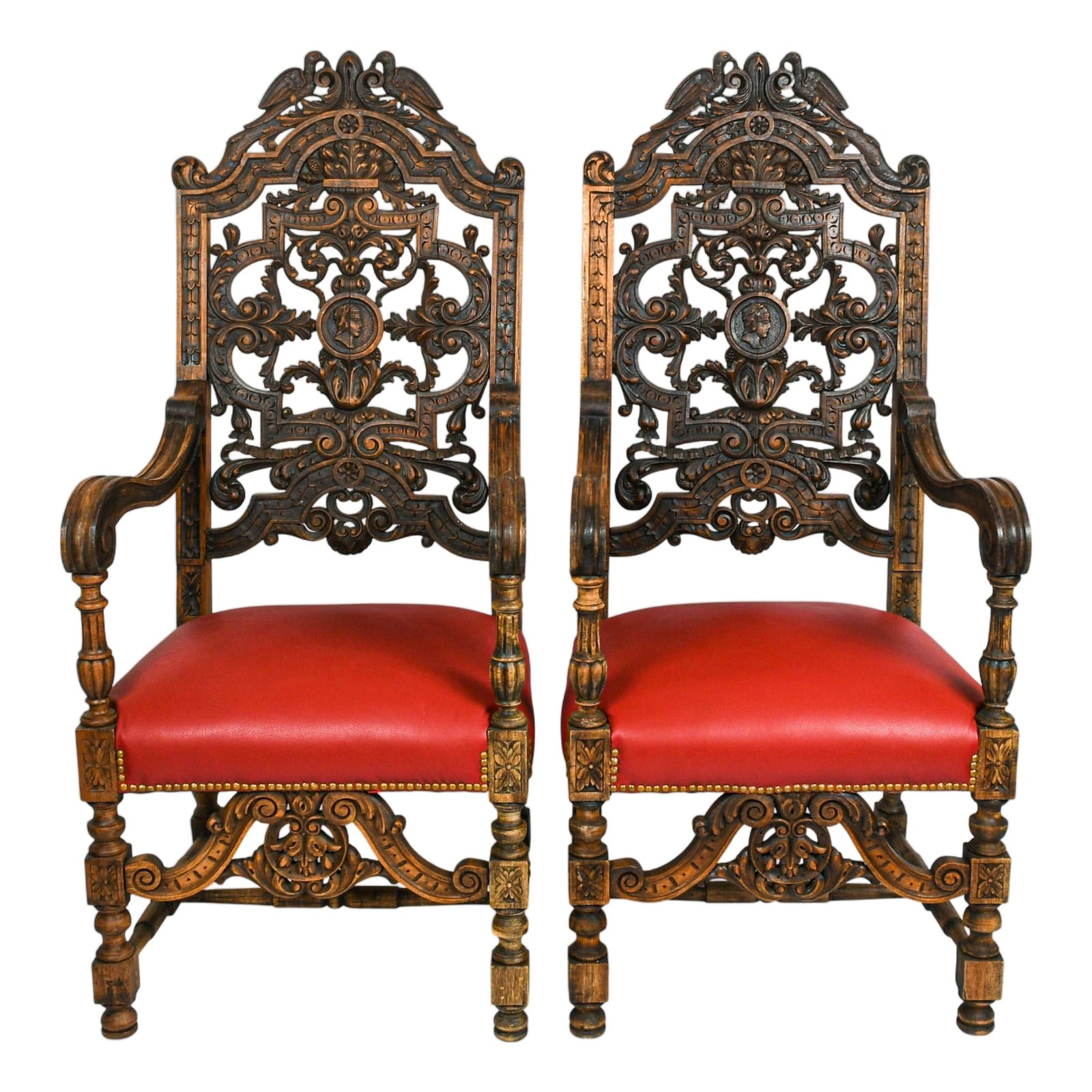 Antique Pair of Carved Walnut Jacobean Revival Throne Chairs With Red ...
