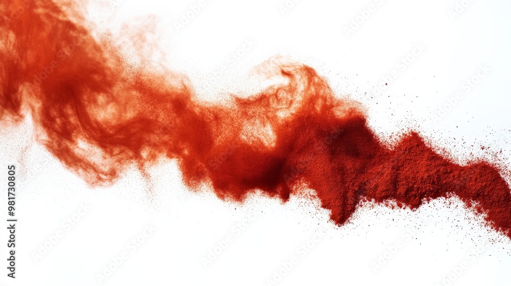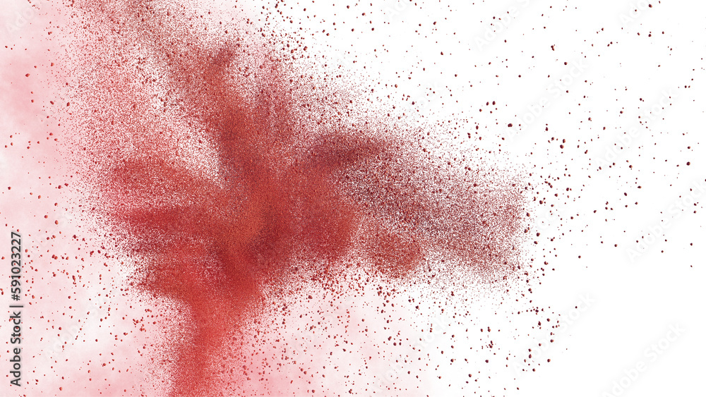 Dynamic red powder explosion spreading in the air against a clean white ...