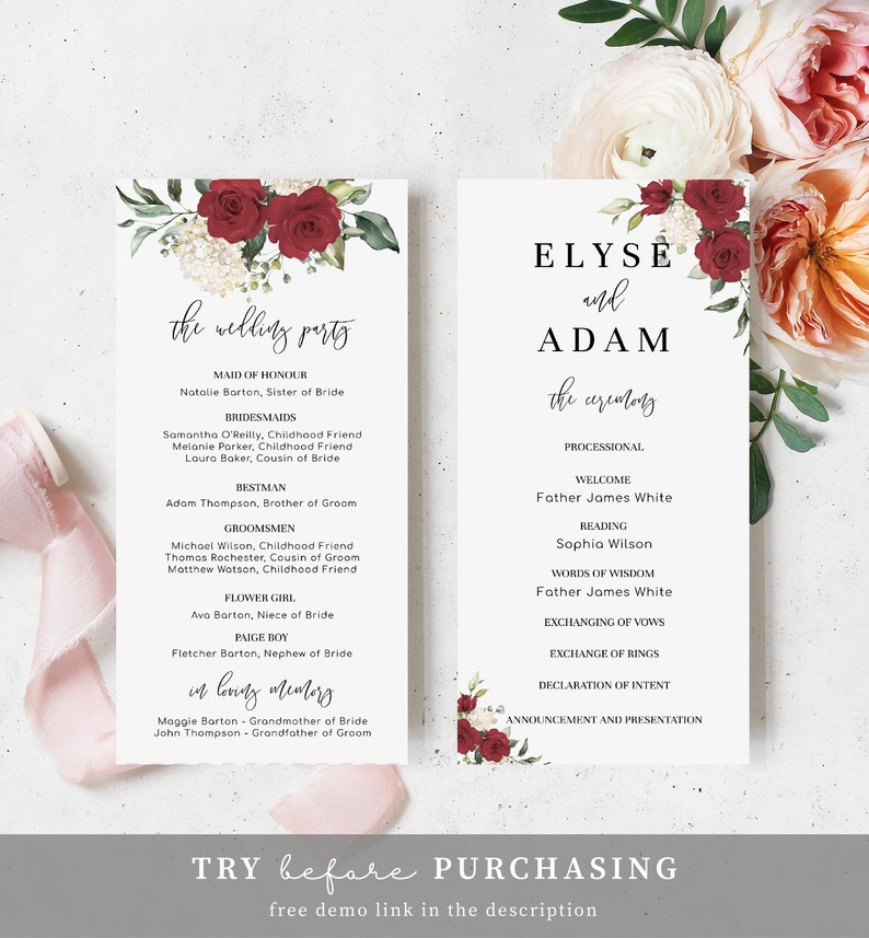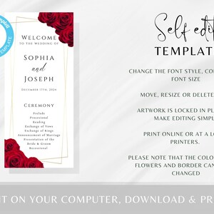 Printable Red Floral Wedding Program Template, Editable Wedding Service ...