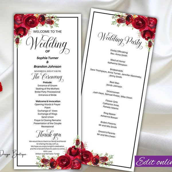 Printable Red Floral Wedding Program Template Editable - Etsy