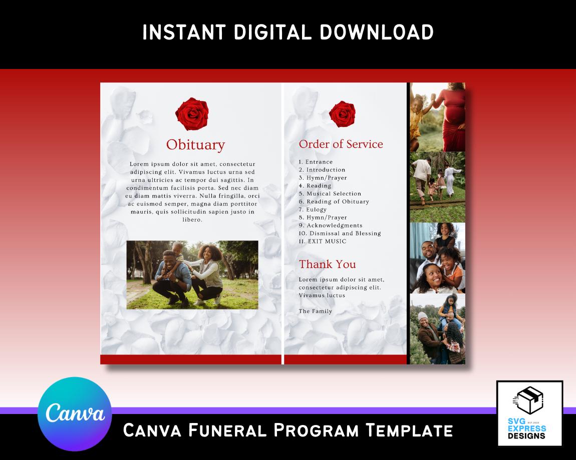 Red Rose Funeral Program Template Canva | 8 Page Memorial Service ...
