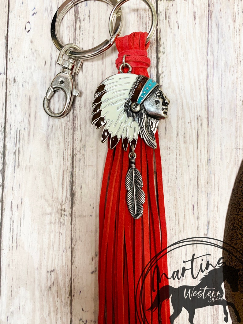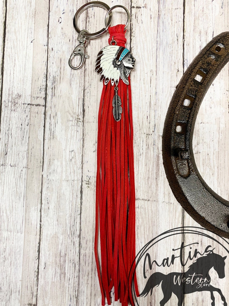 Red Leather Keychain, Bag Charm Native American, Large Tassel, Hippie ...
