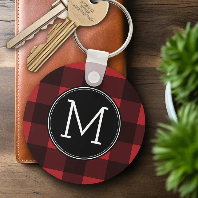 Rustic Red & Black Buffalo Plaid Pattern Monogram Keychain | Zazzle