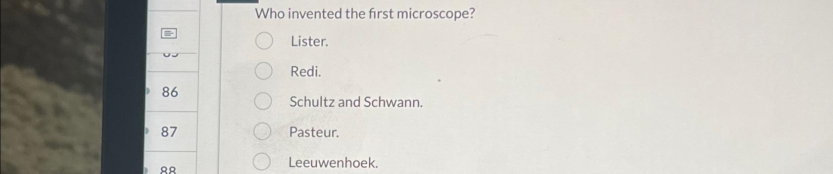 Solved Who invented the first microscope?Lister.Redi.Schultz | Chegg.com