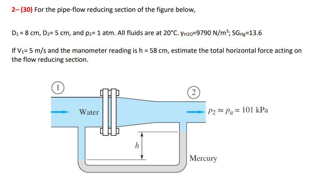 Solved 2- (30) For the pipe-flow reducing section of the | Chegg.com