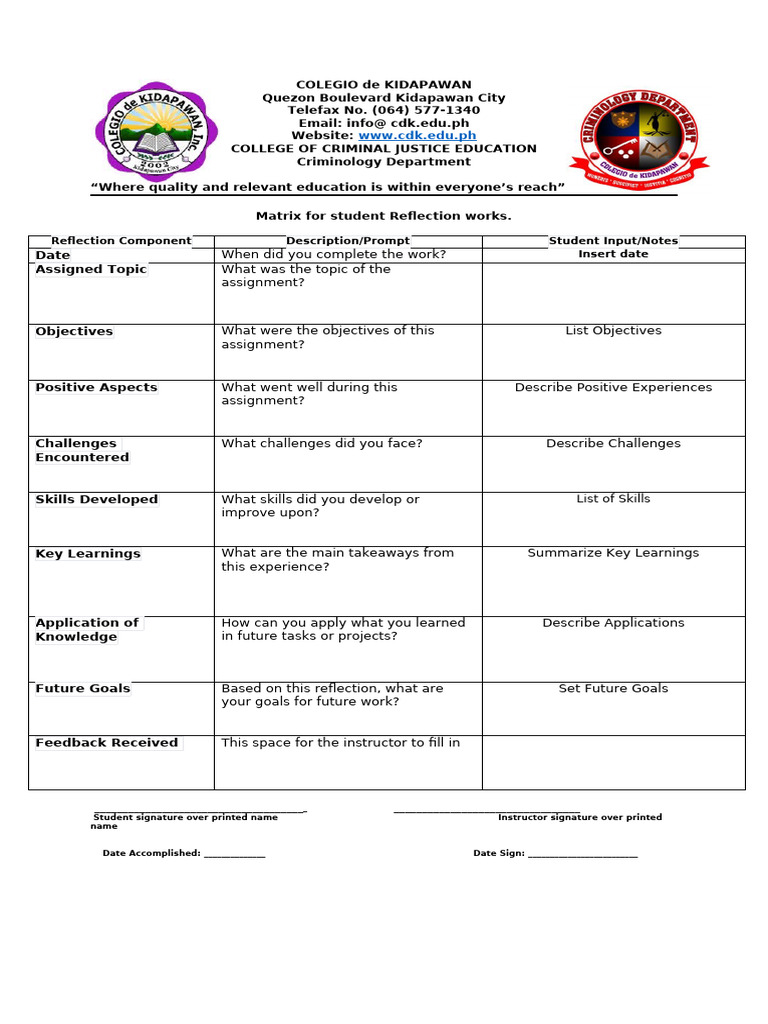 Student Reflection Matrix Template | PDF