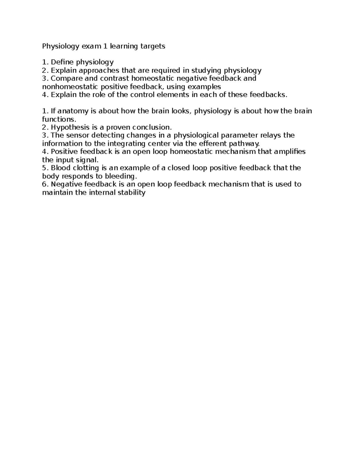 Physiology 101: Exam 1 Learning Targets and Key Concepts - Studocu