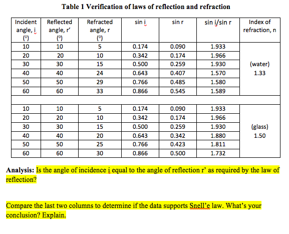 le of Incident and Angle of Reflections Table (1) Law | Chegg.com