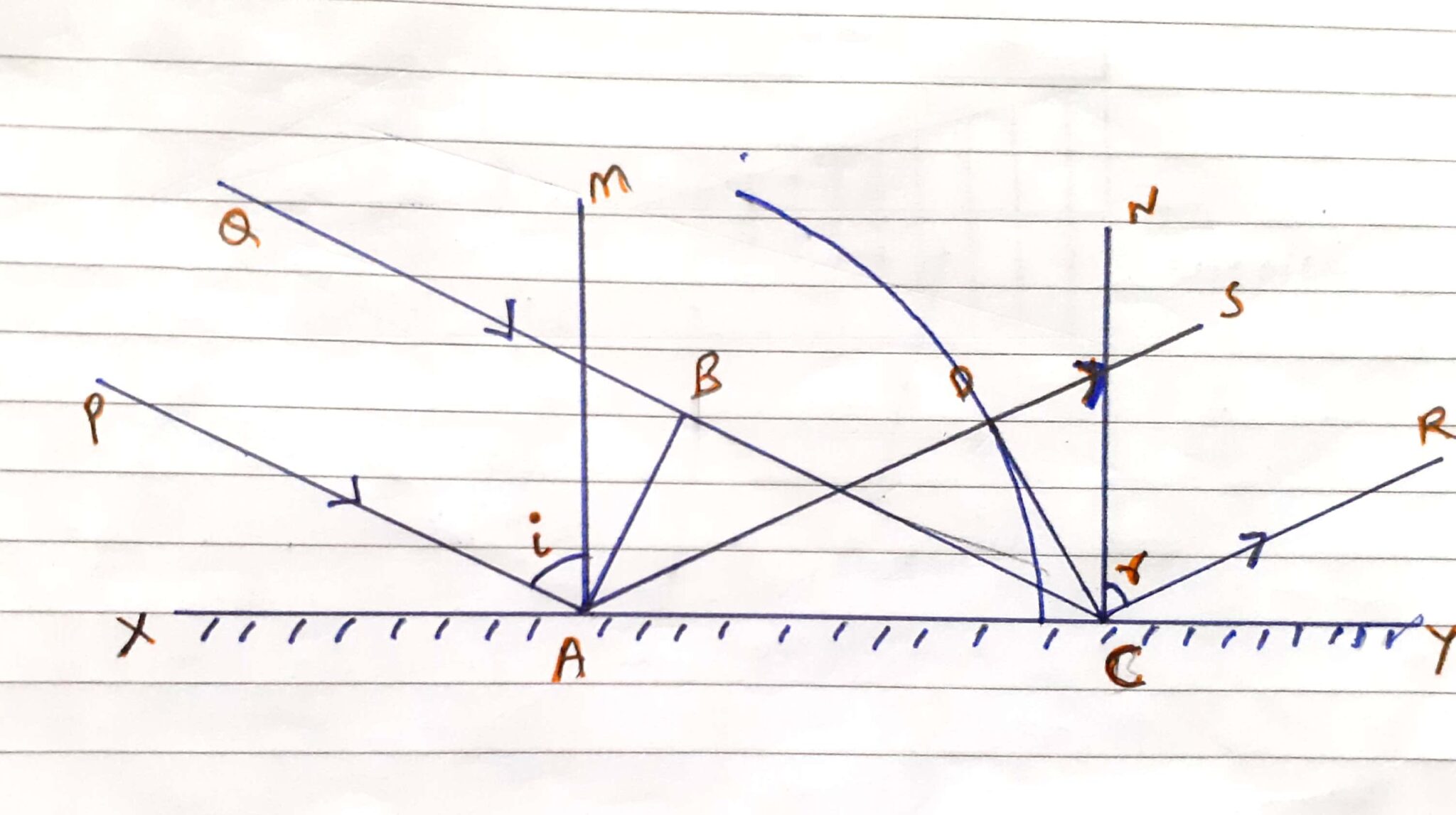 Diagram illustrating the law of light reflection with labelled rays ...