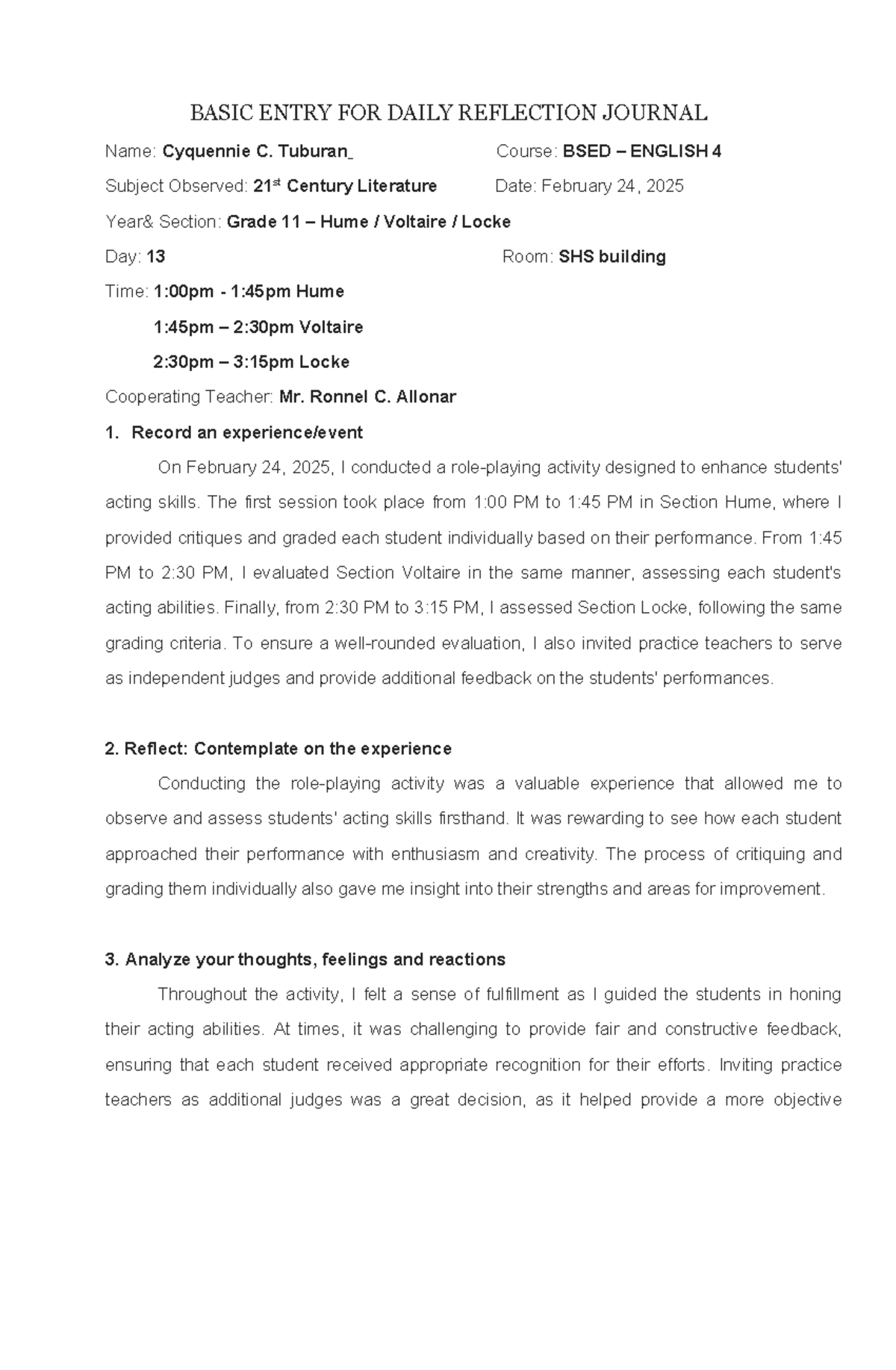 Basic Entry FOR Daily Reflection Journal 1 - BASIC ENTRY FOR DAILY ...