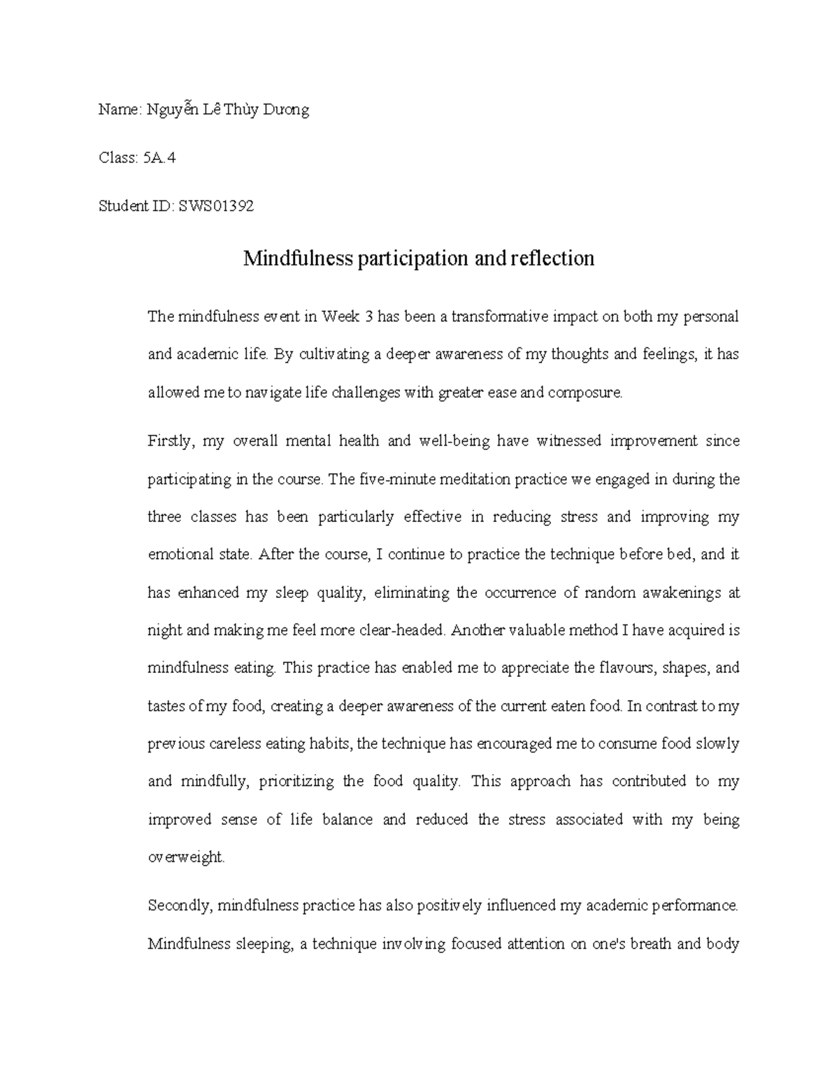 Mindfulness Reflection Essay - Class 5A.4 - Studocu