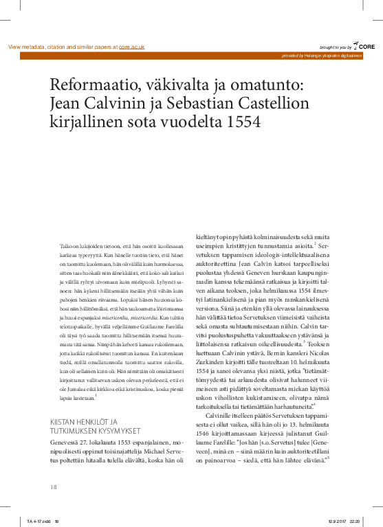 (PDF) Reformaatio, väkivalta ja omatunto: Jéan Calvinin ja Sebastian ...