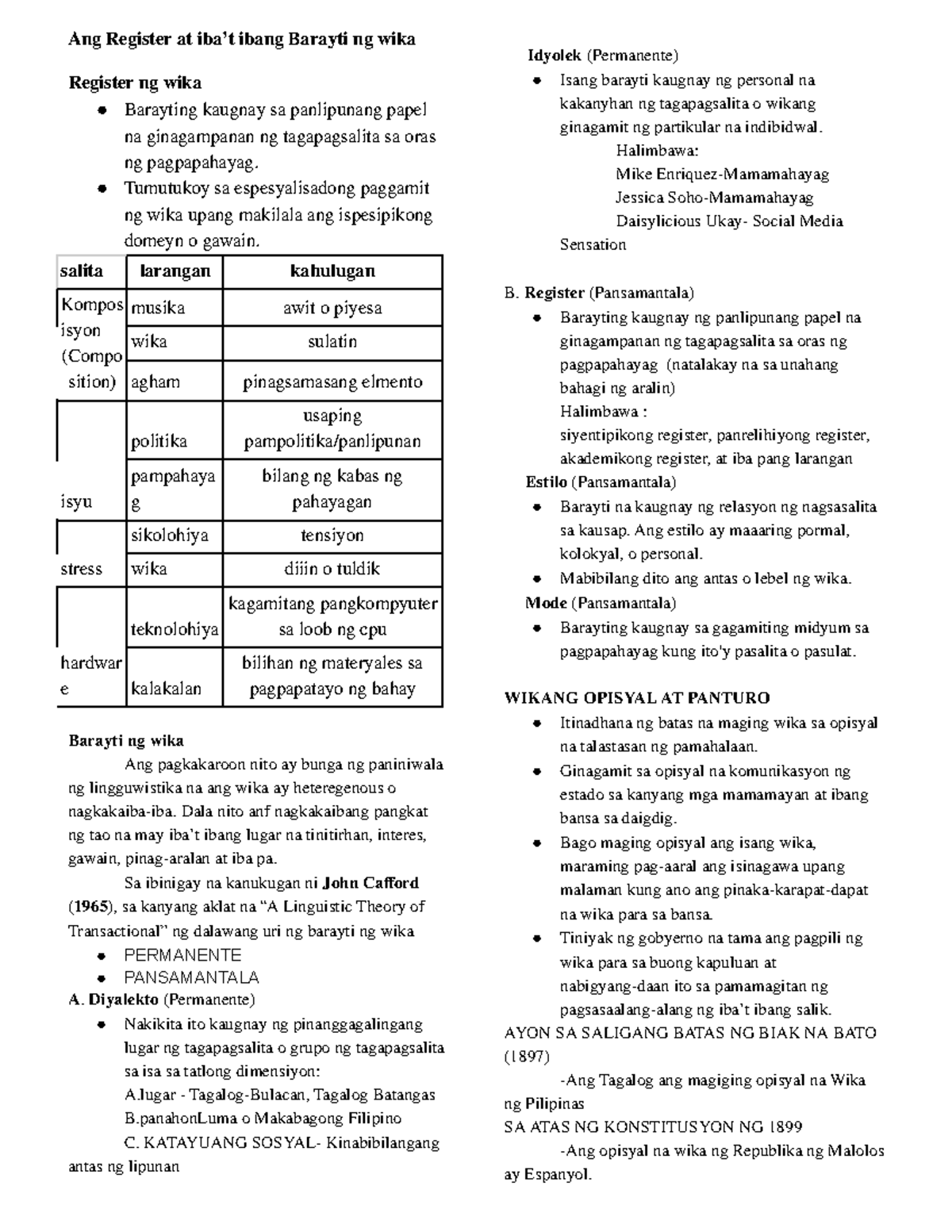 Register bilang Varayti ng Wika | Study notes English | Docsity