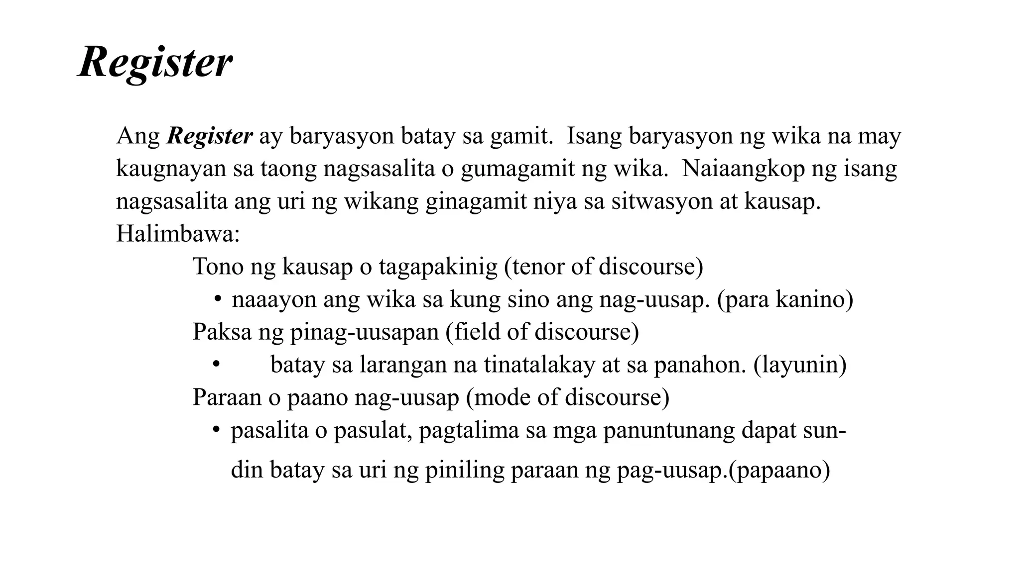 Nalutas:Dimensyon ng register o rehistro ng wika na umaayon sa paraang ...