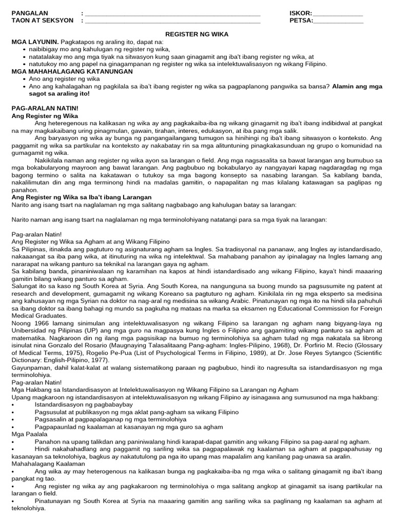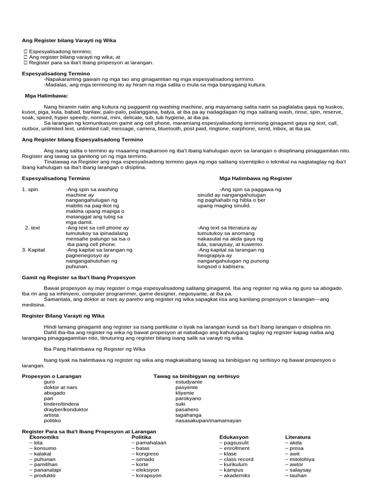 Ang Register Bilang Varayti NG Wika Handouts | PDF