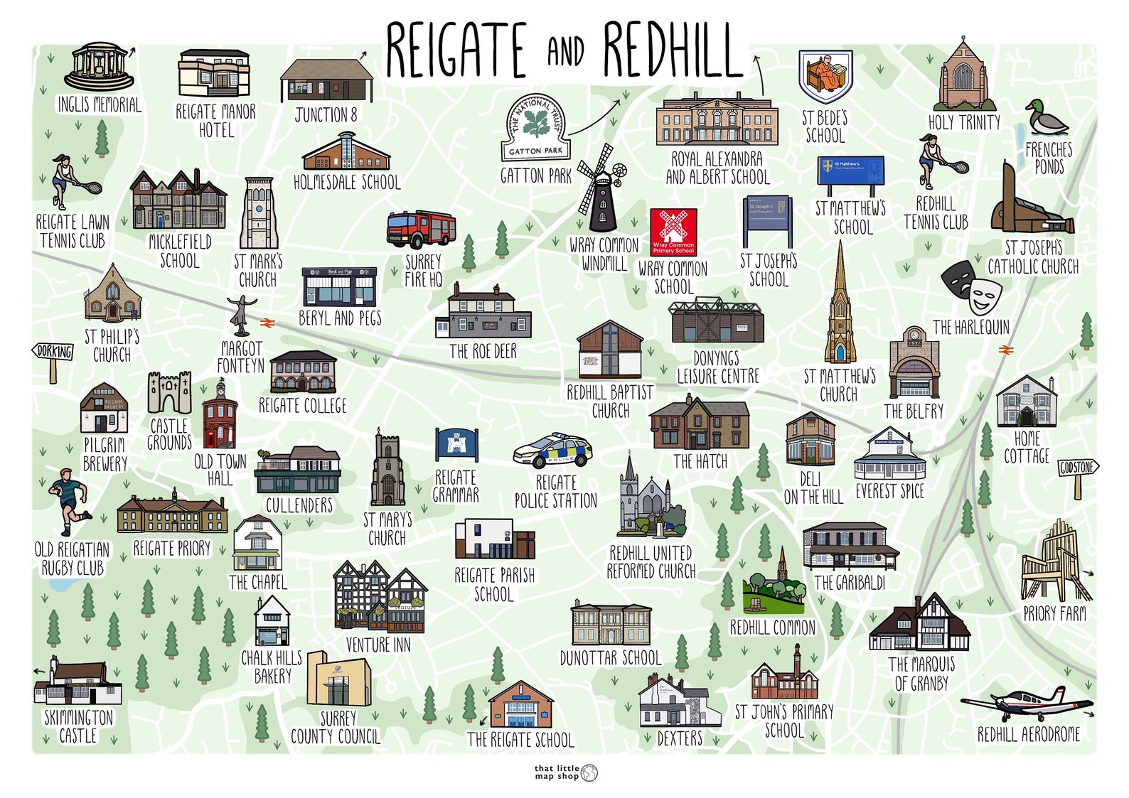 Map of Reigate and Redhill Illustrated Map Reigate Map - Etsy
