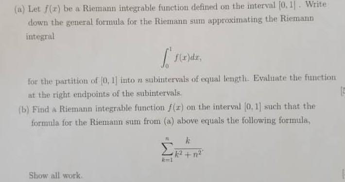 Solved (a) Let f(x) be a Riemann integrable function defined | Chegg.com