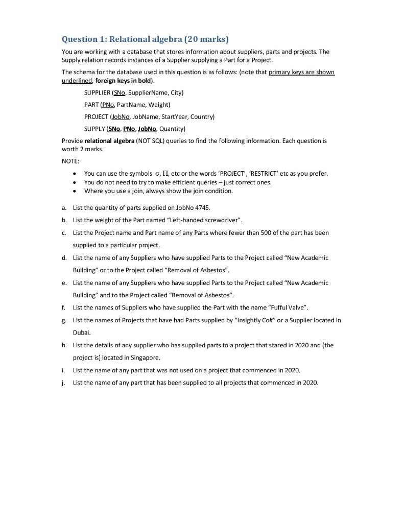 Solved Question 1: Relational algebra (20 marks) You are | Chegg.com