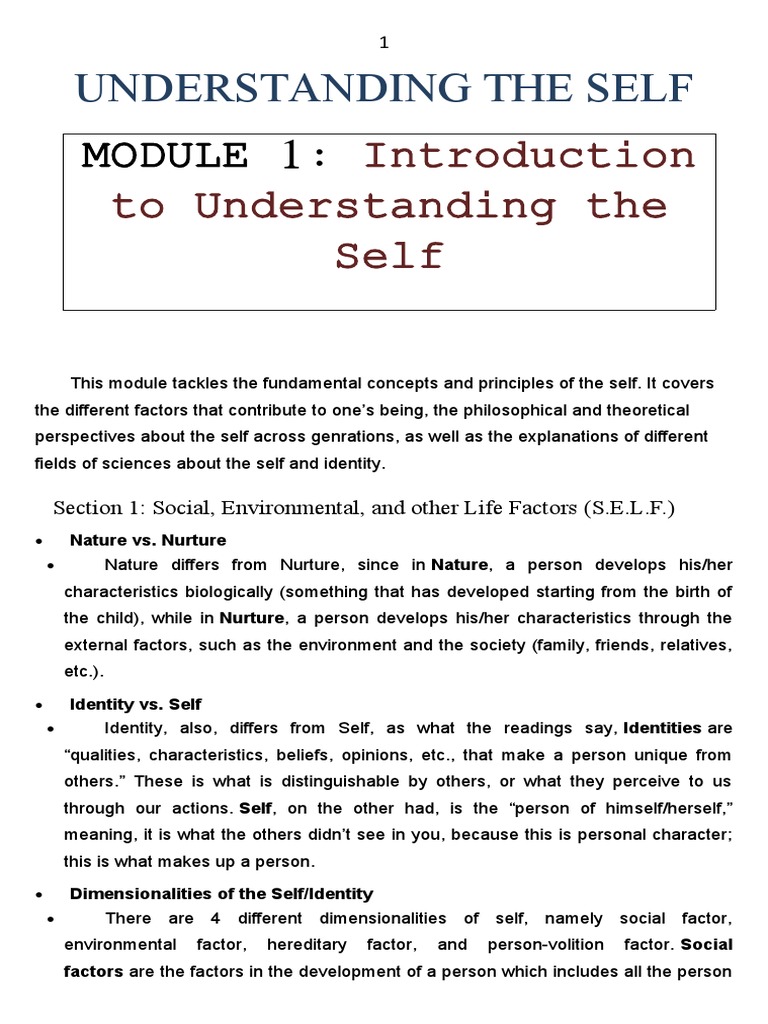 Understanding the Self: Module 1 Overview | PDF | Soul | Mind