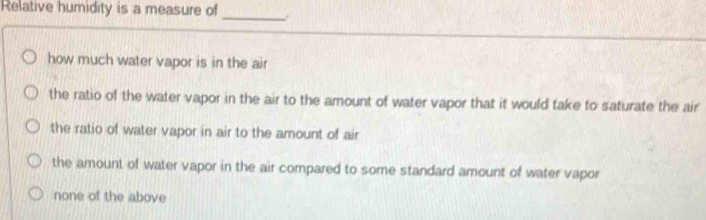 Solved: Relative humidity is a measure of _ how much water vapor is in ...
