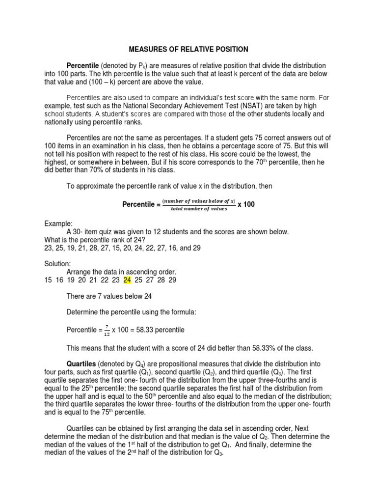 MEASURES OF RELATIVE POSITION | PDF | Quartile | Descriptive Statistics
