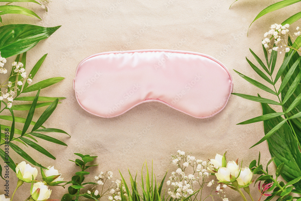 Relax concept. Wellbeing composition with pink mask for sleep, tropic ...