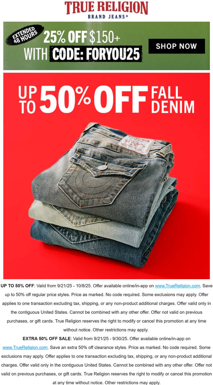 25% off $150 at True Religion via promo code FORYOU25 #truereligion ...